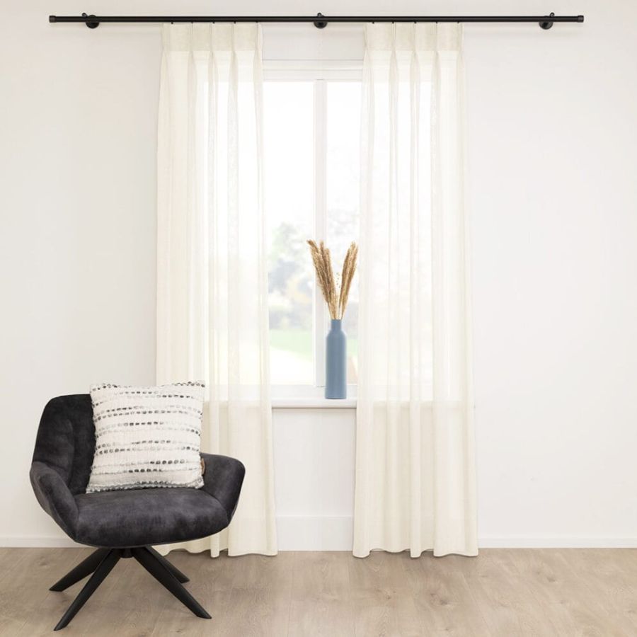 Open geweven vitrage met een natuurlijk ogende linnenlook. De stof is kamerhoog zodat in de confectie geen naden zichtbaar zullen zijn. Aan de onderzijde van de stof is een verzwaringskoord gemaakt, zodat deze prachtig valt en er geen zoom in hoeft.