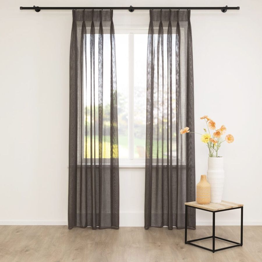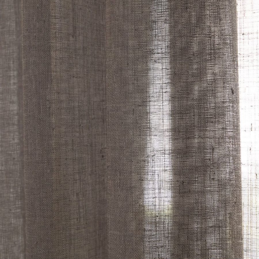 Open geweven vitrage met een natuurlijk ogende linnenlook. De stof is kamerhoog zodat in de confectie geen naden zichtbaar zullen zijn. Aan de onderzijde van de stof is een verzwaringskoord gemaakt, zodat deze prachtig valt en er geen zoom in hoeft.