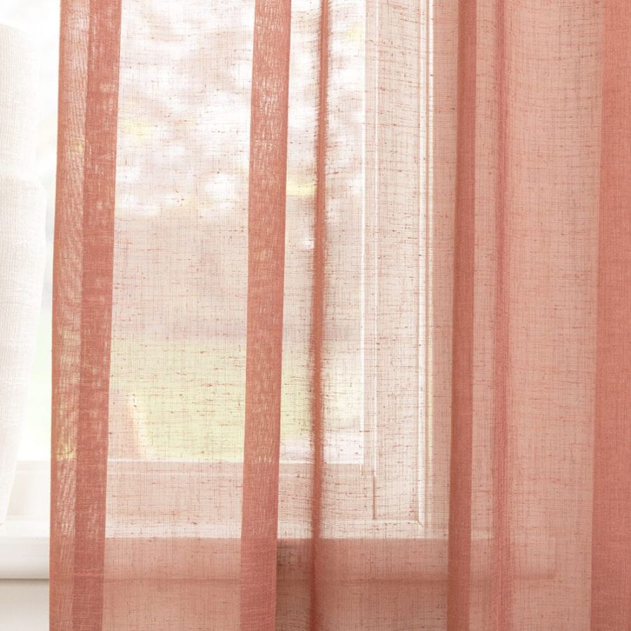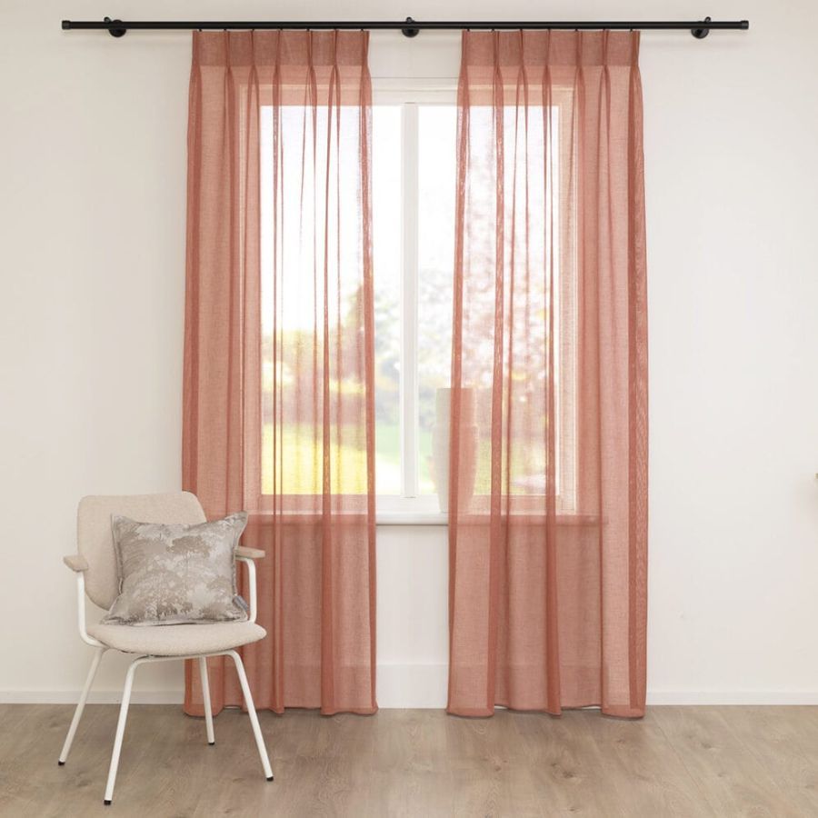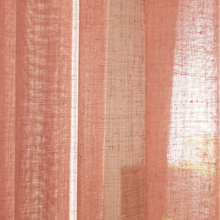 Open geweven vitrage met een natuurlijk ogende linnenlook. De stof is kamerhoog zodat in de confectie geen naden zichtbaar zullen zijn. Aan de onderzijde van de stof is een verzwaringskoord gemaakt, zodat deze prachtig valt en er geen zoom in hoeft.