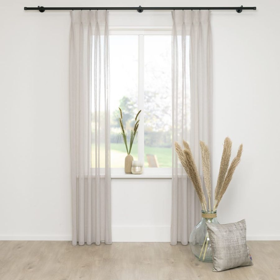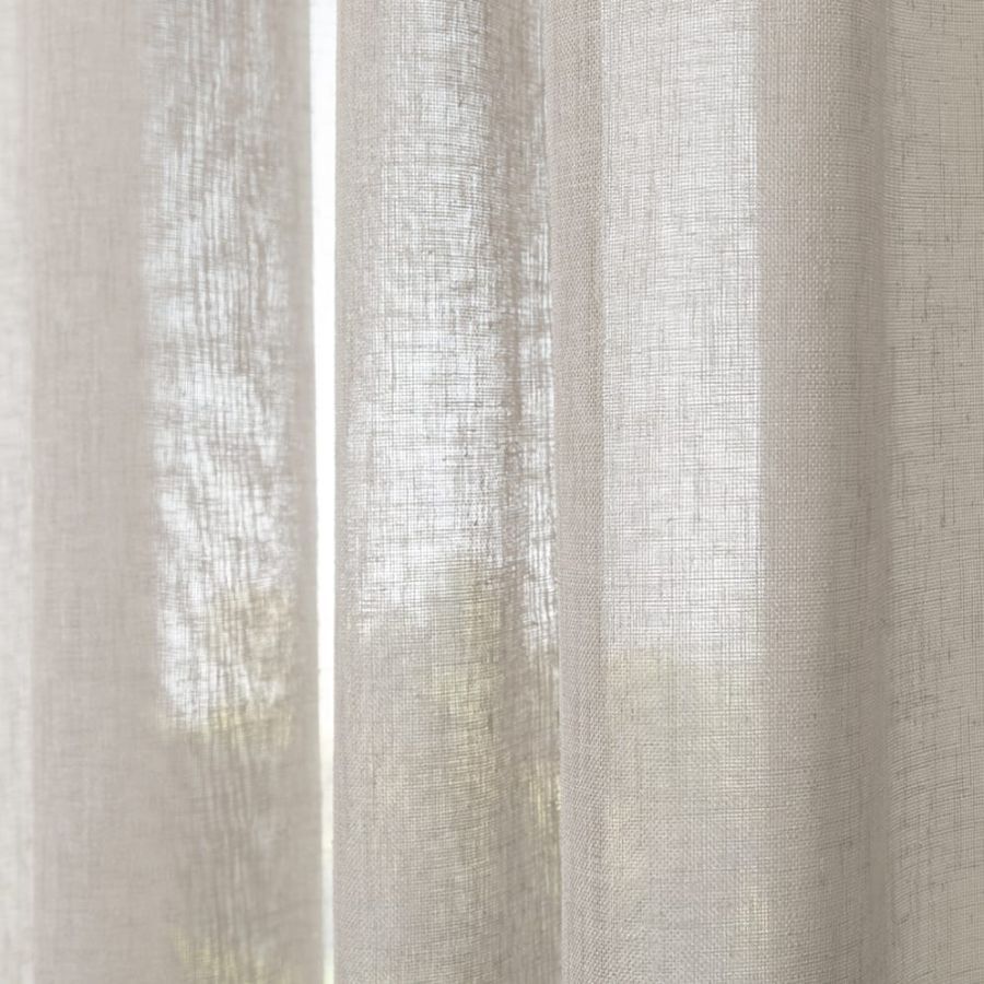 Open geweven vitrage met een natuurlijk ogende linnenlook. De stof is kamerhoog zodat in de confectie geen naden zichtbaar zullen zijn. Aan de onderzijde van de stof is een verzwaringskoord gemaakt, zodat deze prachtig valt en er geen zoom in hoeft.