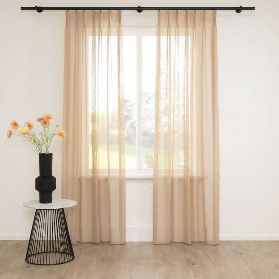 Open geweven vitrage met een natuurlijk ogende linnenlook. De stof is kamerhoog zodat in de confectie geen naden zichtbaar zullen zijn. Aan de onderzijde van de stof is een verzwaringskoord gemaakt, zodat deze prachtig valt en er geen zoom in hoeft.