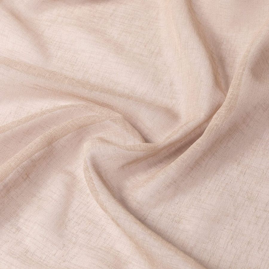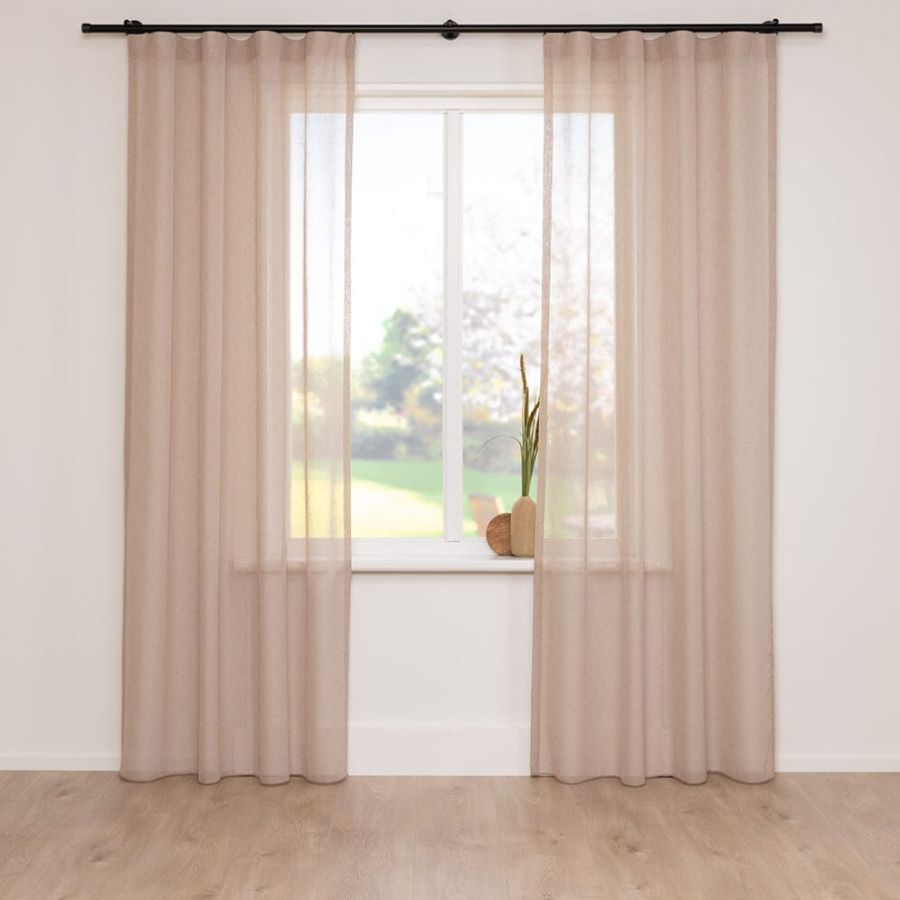 Open geweven vitrage met een natuurlijk ogende linnenlook. De stof is kamerhoog zodat in de confectie geen naden zichtbaar zullen zijn. Aan de onderzijde van de stof is een verzwaringskoord gemaakt, zodat deze prachtig valt en er geen zoom in hoeft.