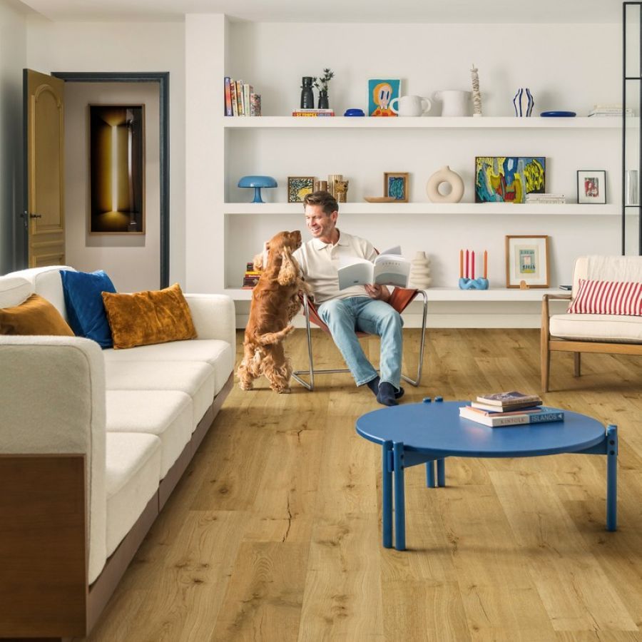 De kleur en de stijl van je vloer hebben grote invloed op hoe je interieur er uitziet. Daarom heeft Quick-Step vloeren in een vrijwel eindeloos aantal kleuren, stijlen en afwerkingen De kleuren van je vloer, plafond en wanden hebben een grote impact op hoe je de kamer ervaart. Afhankelijk van de keuze en de combinaties die je maakt, kun je de specifieke stijl en sfeer van de kamer wijzigen. Vloeren in lichte kleuren maken een kamer luchtiger en optisch ruimer. Lichte tinten geven een kamer bovendien een zuivere, rustieke en tijdloze uitstraling. Lichte houten vloeren passen heel mooi bij donkere meubels en vormen er een verrassende combinatie mee. Om contrasten te creëren, zijn donkere vloeren ideaal. Ze laten zich mooi combineren met lichte wanden of met andere donkere kleuren die je als accent of accessoire gebruikt. Te veel donkere kleuren zullen een somber effect geven dat de sfeer niet ten goede komt. Voeg dus enkele opvallende accessoires aan je interieur toe. Sommige Quick-Step laminaatvloeren zijn verkrijgbaar met en zonder groeven. De aanwezigheid of afwezigheid van groeven heeft invloed hebben op hoe de ruimte er uitziet.
