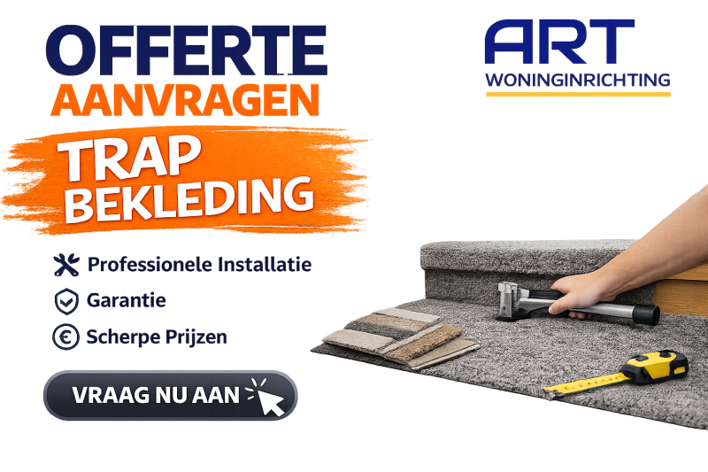 Bij ART Woninginrichting zijn de all-in prijzen voor trapbekleding met tapijt afhankelijk van de gekozen kwaliteit. Onze aanbiedingen beginnen voor een dichte trap tot 13 treden, inclusief tapijt, lijm en montage. Voor open trappen, trappen met meer treden of speciale wensen maken wij graag een vrijblijvende offerte op maat.